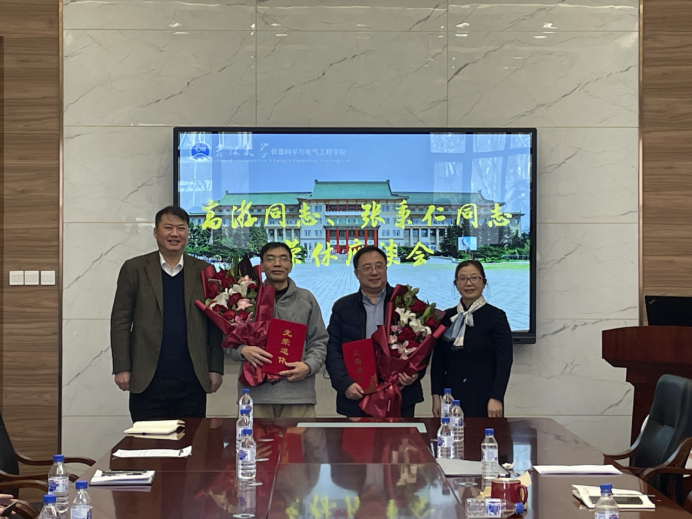 On March 16th, CIEE held a retirement Ceremony for Prof. Gao You and Prof. Zhang Bingren on their honorable retirement. Dean JI Yanju, Party Secretary QIU Zengkai, Vice Dean LIU Changsheng and some teachers of Electrical Department attended the Ceremony. It was hosted by Zhou Zhijian, deputy director of the electrical department of the college.