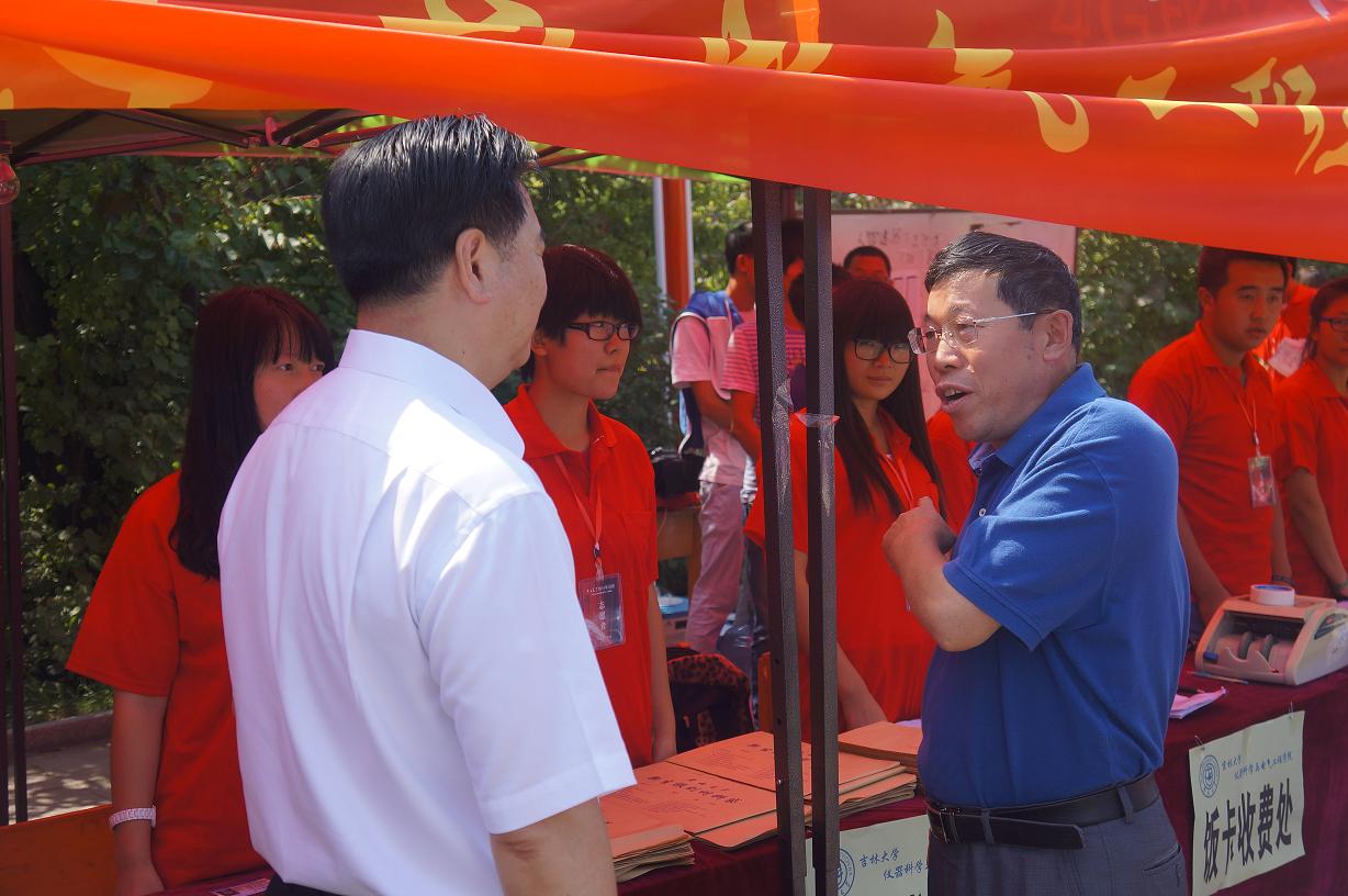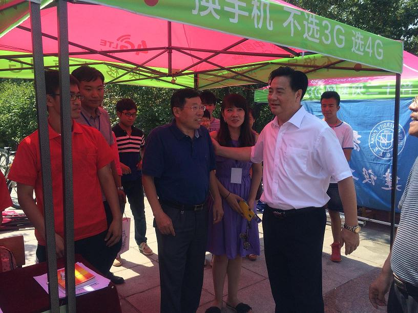 2014年8月30日上午,校长李元元院士、校党委副书记兼副校长韩晓峰教授、副校长张向东教授在学校相关职能部门负责领导陪同下来到中心校区五月花广场视察2014年迎新工作情况。