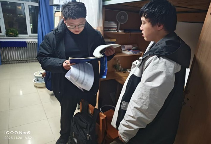 检查团队深入每一间学生宿舍,将评比检查视为一次与学生面对面交流、心贴心沟通的宝贵契机。在检查过程中,史博日老师细致入微地关心每一位同学的学习与生活,在同学的书桌前驻足,翻动书页,亲切询问近期的课程难度与学习压力,关切地了解同学们的饮食习惯与作息规律,叮嘱大家要劳逸结合,保持健康体魄。对于同学们提出的困惑与需求,史老师耐心倾听,并一一给予建议和解答。