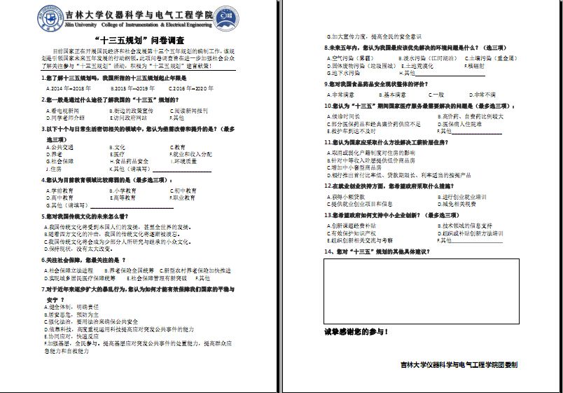 大学生社会实践调研团主要成员于2015年1月25日至27日携带调查问卷数百份,奔赴调研地,先后在长春、九台等地区进行了关于“建言献策‘十三五’”问卷调研活动。虽是严冬酷寒天气,成员们依旧满怀热情,奔走在各个社区、公园以及车站等场所,对基层居民开展了问卷调查。实践团成员热情耐心地向被调查人员说明调查目的,在征得同意后协助他们认真完成调查问卷相关内容并选取有代表性的人员进行简短访问。由于此次调研涉及多个地点,成员们为了提高效率,节约时间,实践团成员分成多个小组奔赴各地。无论是身上的疲惫还是恶劣的天气都没有浇灭同学们的热情,面对每一个调研对象,仍旧充满感激与虔诚。最终,团队圆满完成任务,发放调查问卷350份,回收348份,其中有效问卷达340份。